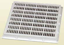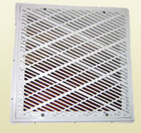 Square frame and grate made of white ABS. it is produced in 250x250 mm , 300x300 mm and 450x450 .it is available just for concrete pools. it is chemical resistant and UV-protected.