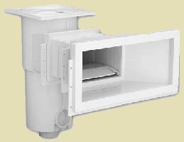 Injection molded skimmer of high ABS strength. designed for both traditional concrete and liner pools are available in both straight and extended mouth version. they offer a quiet surface skimming in a maximum performance. the skimmers have parallel reinforcing grooves for extra durability. they also bear a safety lock-down lid and an extra large basket which self-blocks into the skimmer body. a basket-handle ensures easy removal off the basket. the skimmers are provided with square cover and rubber seals that clip on to the flange. those seals are colored blue or white for a more discreet finish. the flap stopper ensures a silent flap operation. working site protection stickers are delivered with each unit.