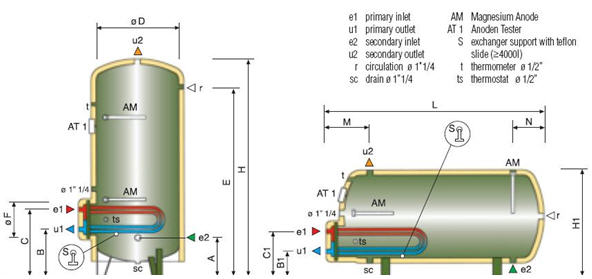 • Galvanised steel-type GS: Hot dip galvanising deposits a zinc layer which provides excellent protection against corrosion if the water is hard. galvanised calorifiers should not be used with copper pipe-work or soft water. the copper causes electrolytic action and releases particles of copper which deposit in the calorifier, causing localised electrolytic action and corrosion. soft water prevents formation of a protective scale. the copper tube bundle rapidly gets a film of scale because of its higher temperature. this prevents electrolytic action and corrosion. For added protection a magnesium sacrificial anode can be fitted. this must be replaced when exhausted. also the copper tube bundle can be electro-tinned which reduces the electrochemical potential.